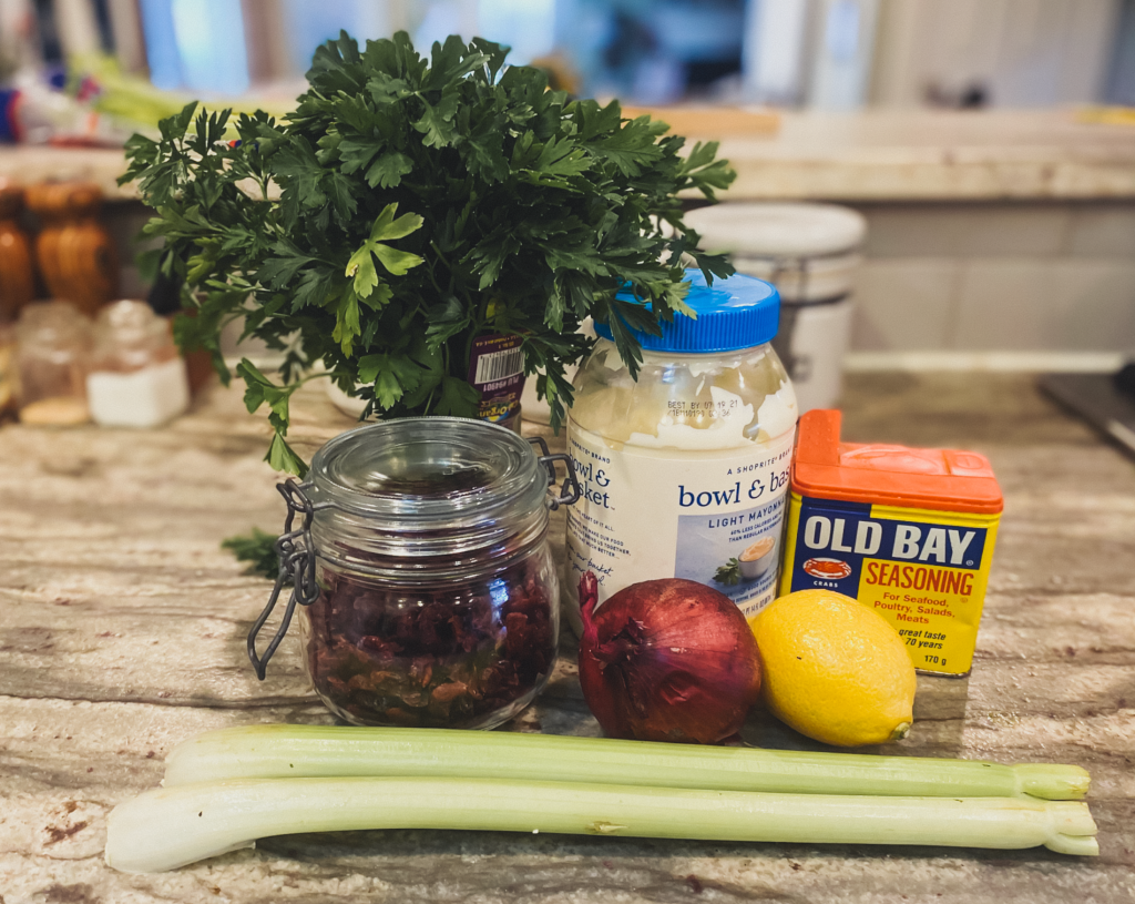 - Finely dice red onion, celery, and fresh parsley. Combine in a medium sized bowl with zest from the other half of lemon and cranberries, squeeze juice of lemon over the mixture. Add mayonnaise and mix to combine all ingredients well.